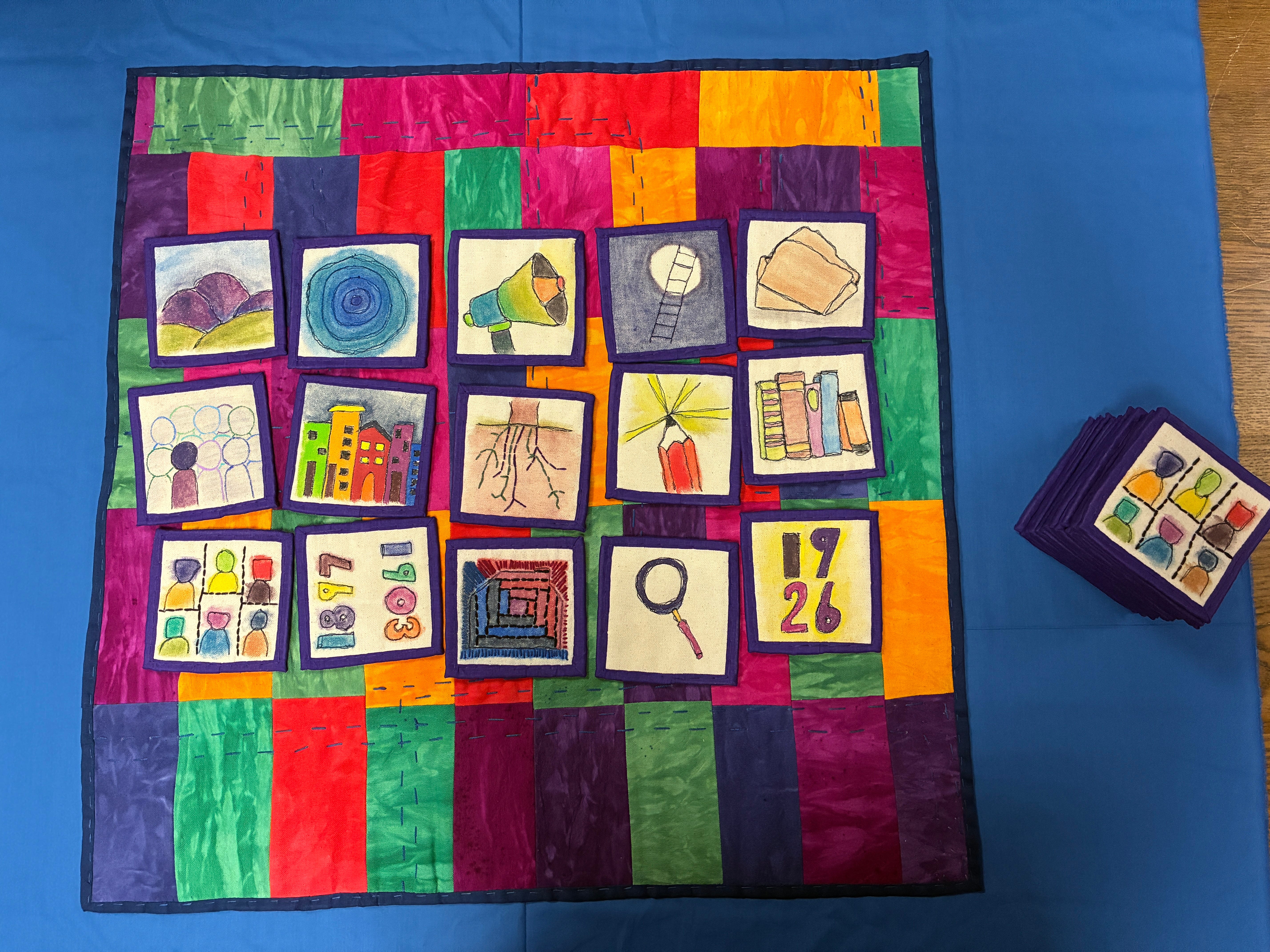 The epiphany came when I was encouraged to connect my creative practice with my research practice and apply for an artist’s grant, as an artist. I wrestled with the idea that “I’m not an artist.” But through the application experience, the subsequent awarding, and the process of making and eventually sharing my initial memory game quilts, I became the kind of artist I didn’t know was deep within. Now, I could see the connection between knowledge, art practice, and connection. Summer 2025, when I embarked on those first sets of artworks, the memory game quilts, I found my body embracing a new kind of peace and acceptance I hadn’t felt before. My attention was fully focused on experiencing the unfolding of the quilted games and ideas flowed alongside my future aspirations to show this work widely. My breath softened, and I settled into the rhythms and vibrations of being a producing artist. I was engaged in the microstories from the Berea College Archives and enthralled by the stories that were emerging as I constructed, stitched, illustrated, and painted fibers into symbols of memory.